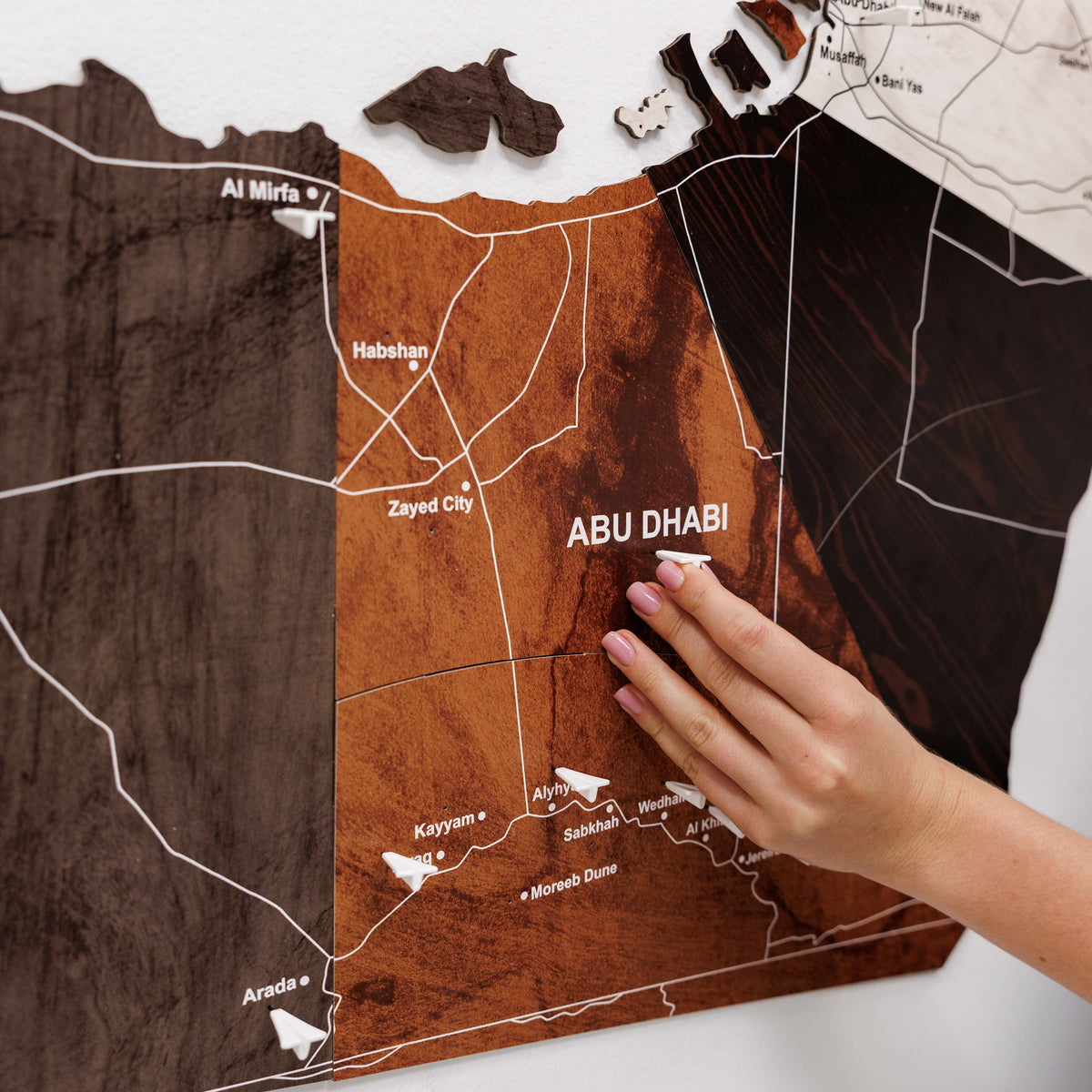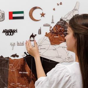Personalize your map by adding photos of your cherished moments and adventures throughout the UAE. This map serves as a visual reminder of the places you've explored and the memories you've created. For an added touch of personalization, use charming airplane pins to mark your favorite destinations ✈️.