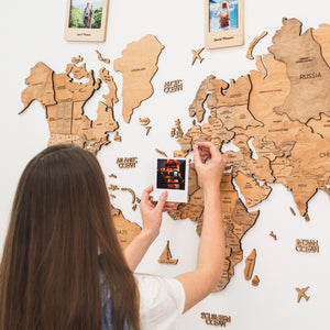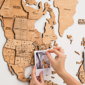 The Light series showcases a soft, natural wood finish, creating a one-of-a-kind work of art. Each map is unique, with varying shades that reflect the beauty of natural wood. Personalize your map by adding photos from your travels and tiny flag pins to highlight your favorite destinations.