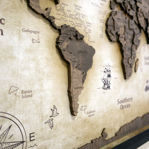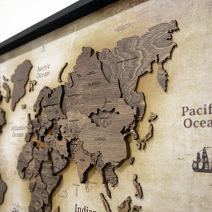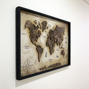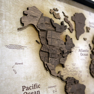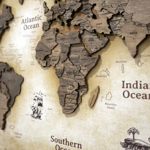 3D Wooden World Map on Panel - Dark Walnut Vintage