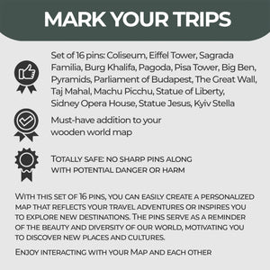 These pins are ideal for travel enthusiasts and geography lovers who want to add a touch of personality and style to their Wooden World Map. Each pin is crafted from high-quality materials and designed to replicate the iconic silhouette of the landmark it represents. The sharp tips allow for easy insertion, while the flat head design provides ample space to showcase the landmark's details.
