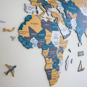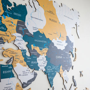 How to make your room look its best with a single piece of décor? Easily with our 2D world map on the wall! The item from the Mystery collection has a neutral palette. The mix of beige, dark-turquoise, gray, and white colors plays well with any interior – from industrial and rustic to transitional and modern.