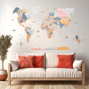 The assembling process is easy and can be done by yourself. The package includes map pieces, ocean names, wooden planes, boats & compass, double-sided sticky tape, instruction, corner stencils, and a lifetime warranty.