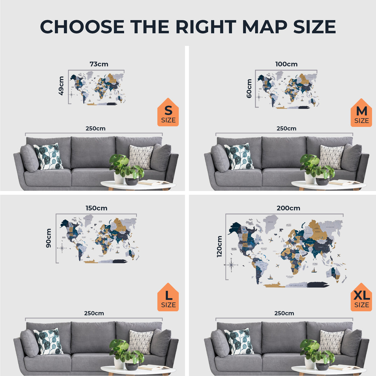 How to make your room look its best with a single piece of décor? Easily with our 2D world map on the wall! The item from the Mystery collection has a neutral palette. The mix of beige, dark-turquoise, gray, and white colors plays well with any interior – from industrial and rustic to transitional and modern.