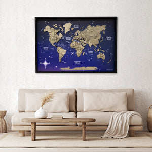 Featuring a single panel with a mix of warm brown shades and a galaxy-inspired Space background, this Terra color wooden world map serves as a stylish focal point. It quickly draws the eye to the area where it is mounted, whether above a bed, sofa, dining table, or in the office.