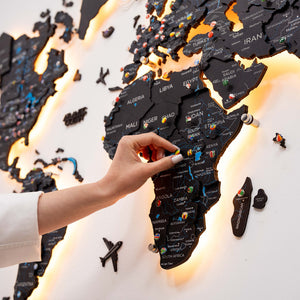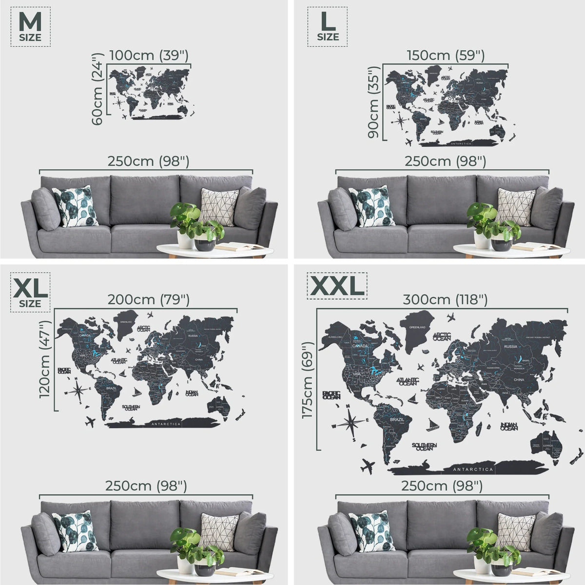 The 3D Wooden World Map LED - Midnight is available in the following sizes: M (100 x 60cm), L (150 x 90cm), XL (200 x 120cm), XXL (300 x 175cm). Each size is designed to make a bold statement in your living room, bedroom, or office. The luminous layer provides both beauty and function, making it a perfect gift for St. Valentines, Ramadan, or any other special occasion 🎁.