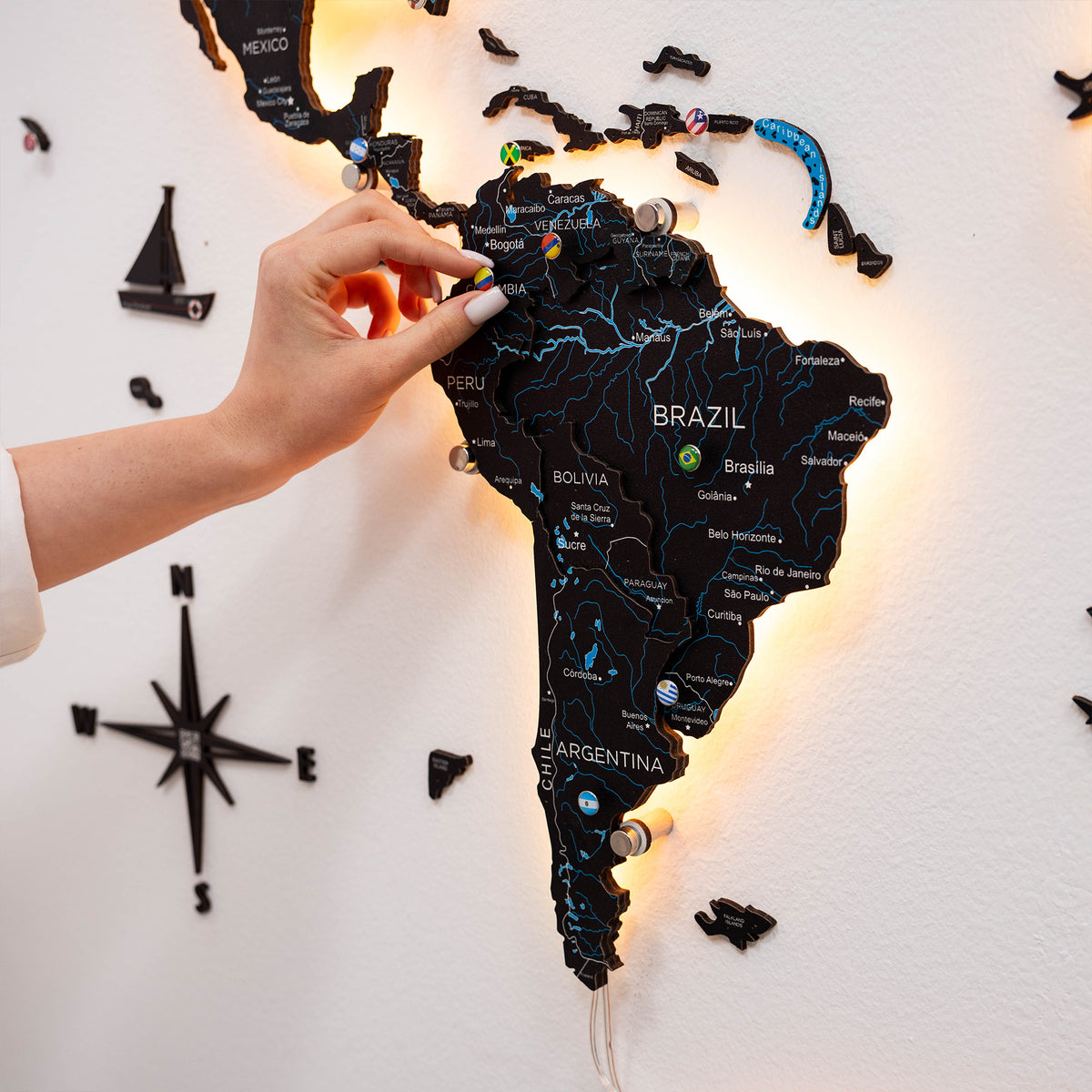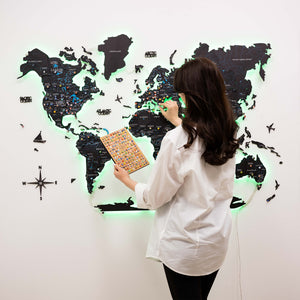 Introducing the 3D Wooden World Map LED - Midnight, now with a free upgrade that includes a luminous layer! 🌍✨ This exceptional premium wall decor not only serves as a stunning piece of art but also features LED lighting that makes the map glow in the dark for up to 2 hours, adding a unique, captivating ambiance to any room. Whether it's for office decor or as a VIP gift, this wooden wall decor is sure to impress.