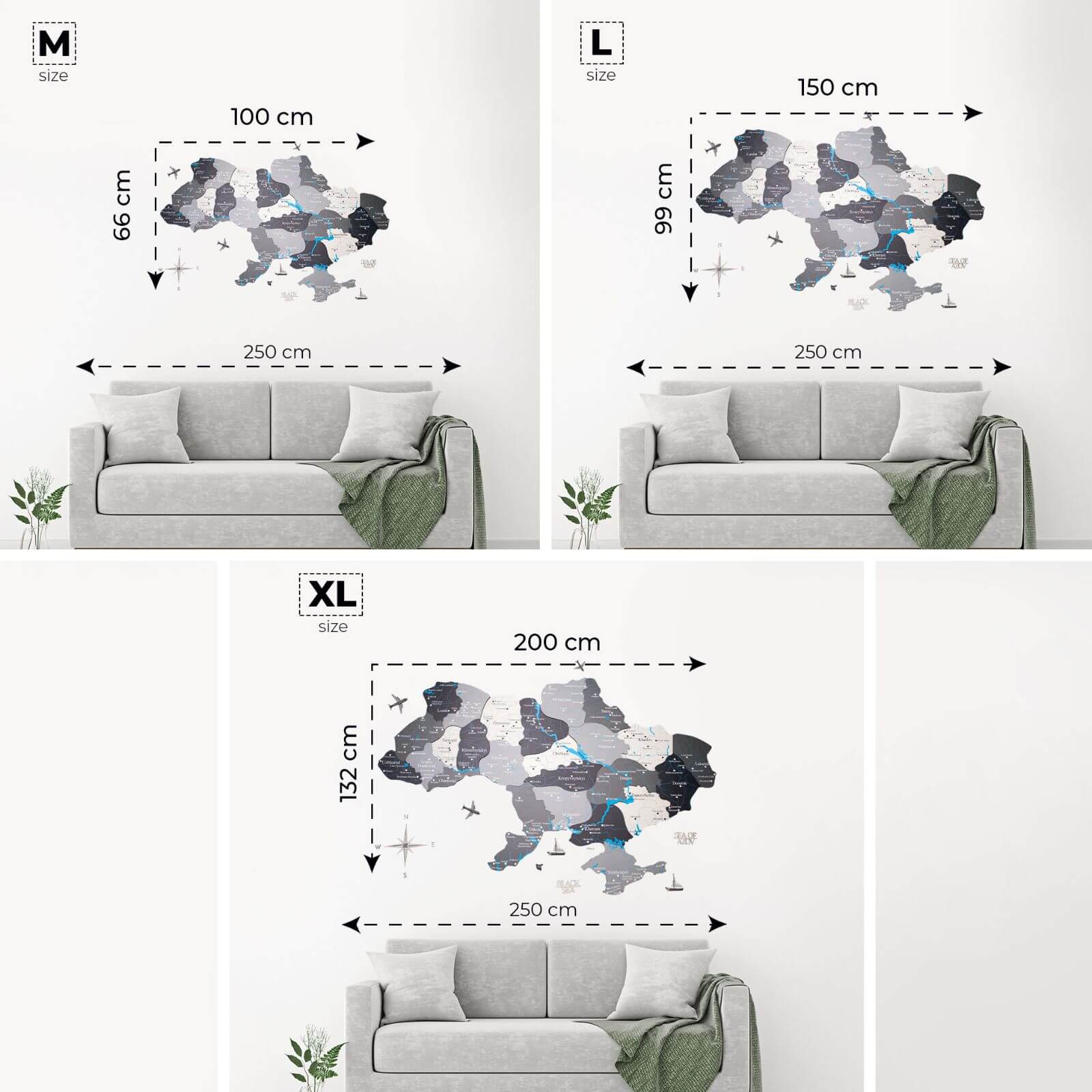 The package includes a wooden compass, planes, boats, sea names, and Coat of Arms of Ukraine, and detailed instructions are provided for easy wall installation. The special double-sided tape used is strong enough to hold the map pieces on the wall without damaging wallpaper.