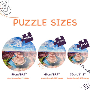 We offer three variations of our puzzles, each differing in size and the number of pieces: an easy version measuring 30 cm with 167 pieces, a medium version measuring 40 cm with 388 pieces, and a hard version measuring 50 cm with 455 pieces..