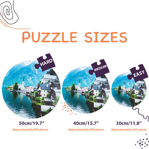 We offer three variations of our puzzles, each differing in size and the number of pieces: an easy version measuring 30 cm with 167 pieces, a medium version measuring 40 cm with 388 pieces, and a hard version measuring 50 cm with 455 pieces..