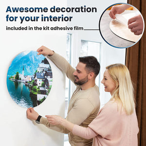 We have created a special round sticky tape designed to be placed on the back of the completed puzzle, allowing you to easily hang it up. This tape is included with every puzzle and applying it is a straightforward process. To attach the tape, simply flip the assembled puzzle upside down and affix the sticker. Then, you can use any double-sided tape to hang the puzzle on the wall.