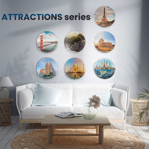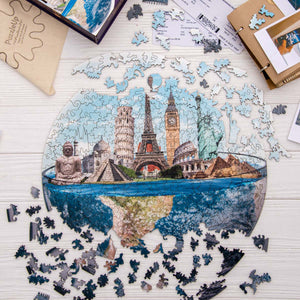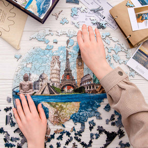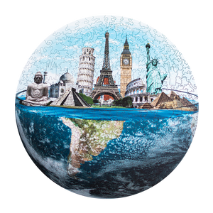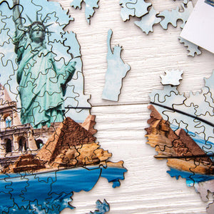 World's Attraction wooden Jigsaw Puzzle is a wonderfully crafted collage of the best places in the world. Some of these landmarks include the Eiffel Tower, Big Ben, the Statue of Liberty, Rome's Colosseum, the Taj Mahal, the Egyptian pyramids, etc.