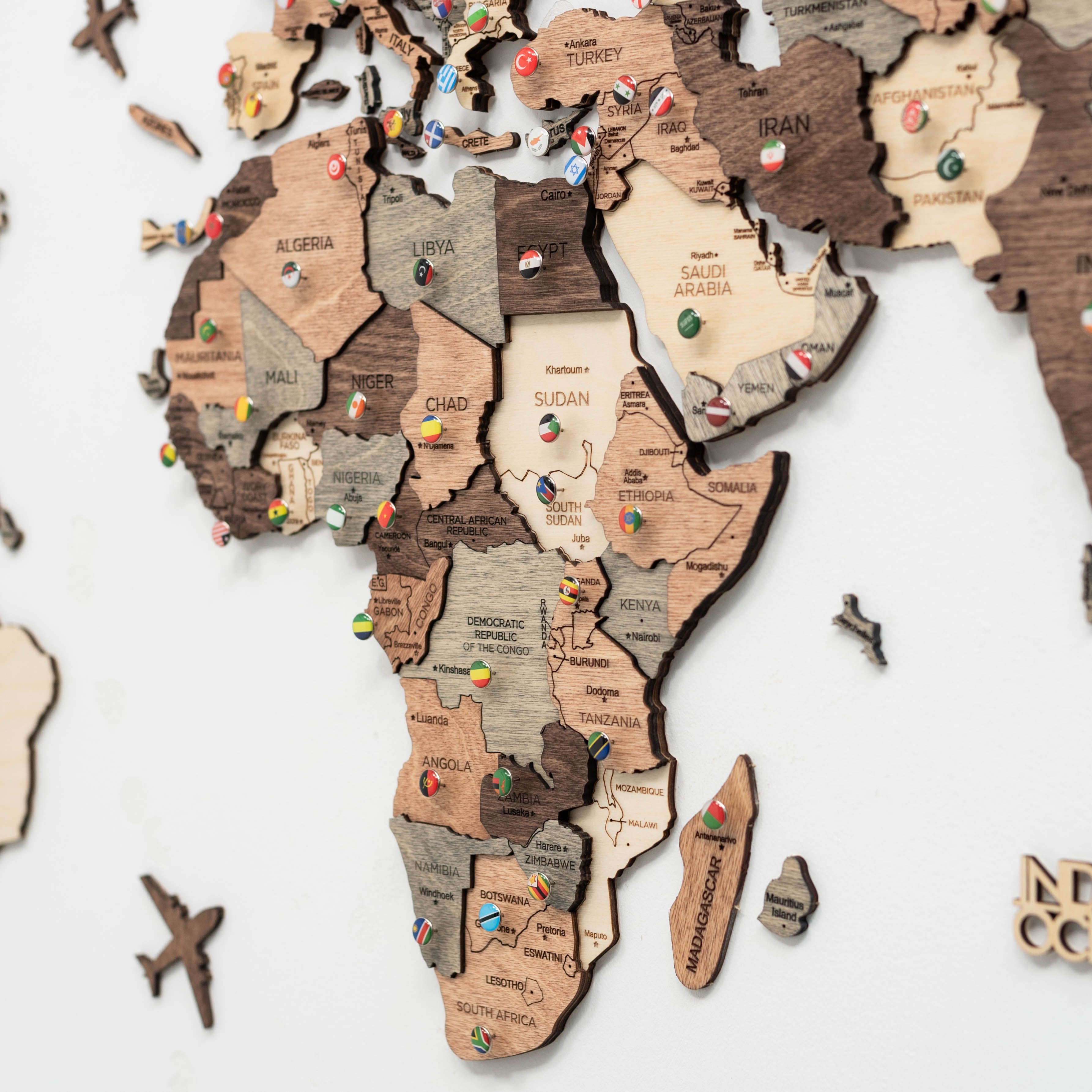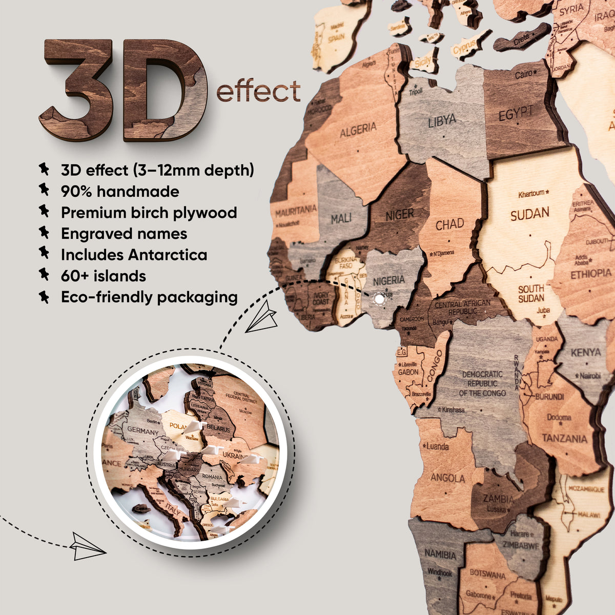 Introducing the 3D Wooden World Map - Smokey, a unique gift idea for any occasion, an exceptional wall decor, or a creative travel planner that beautifully transforms your environment into a tribute to adventure and exploration.