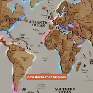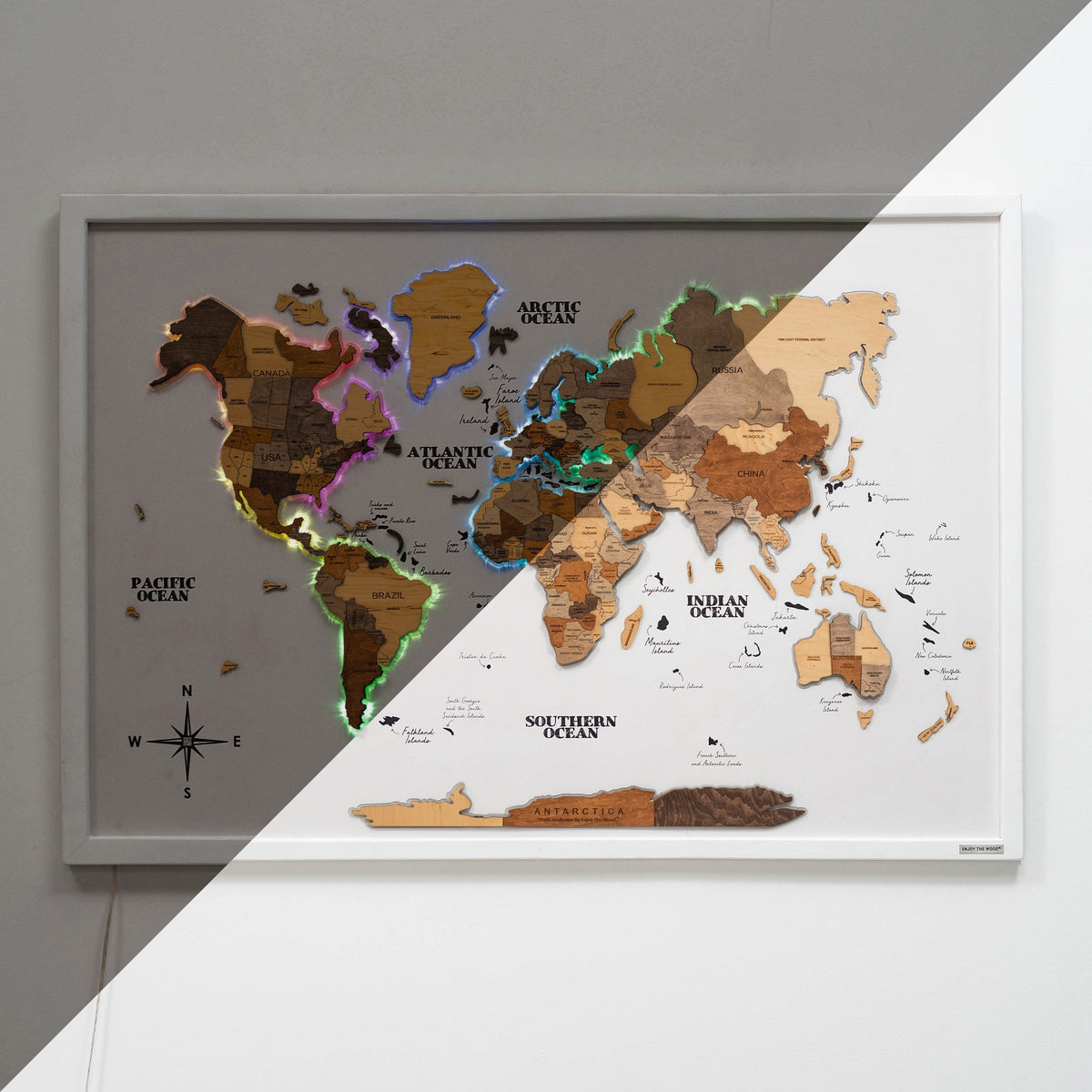Bring your walls to life with our 3D Wooden LED World Map – Multicolor on White Frame, a statement piece that blends art, craftsmanship, and modern lighting. Perfect for adding a touch of elegance to living rooms, offices, or reception areas, this premium wall décor features precision-cut wooden continents in vibrant colors, mounted on a sleek white frame with built-in LED illumination.
