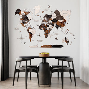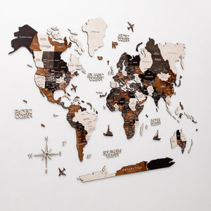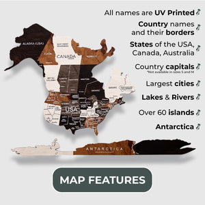 You may customize your map with nicely engraved ocean names and wooden decorations such as planes and boats. The Antarctica panel and an elaborate compass are also included.